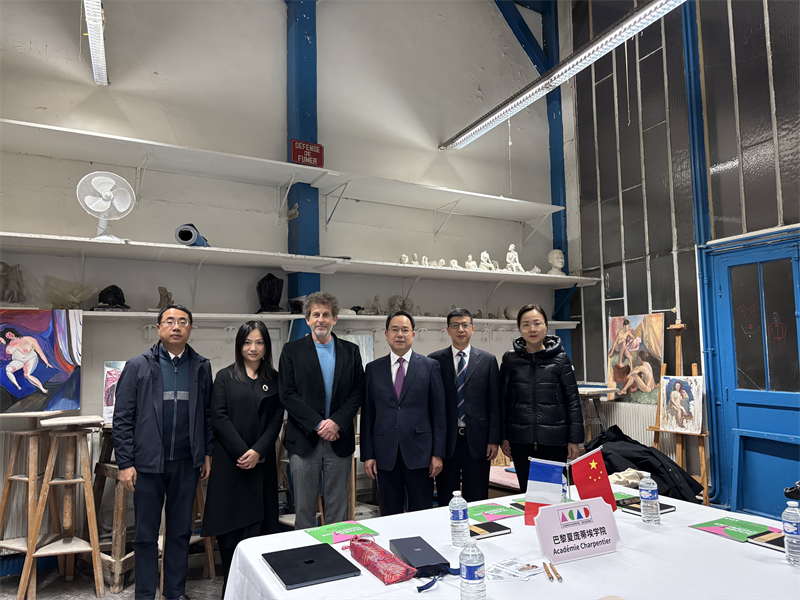 在法国巴黎夏庞蒂埃学院,梁瑜与巴黎夏庞蒂埃学院校长塞尔日•扎格丹尼斯基(Serve ZAGDANSKI)及相关负责人进行座谈。双方就艺术领域尤其是室内空间和建筑设计人才培养交换想法与见解。代表团一行走访参观大茅屋画室创作工作室、建筑室内设计工作室等,并诚挚邀请塞尔日•扎格丹尼斯基先生等来院考察交流,推进双方深层次合作交流。