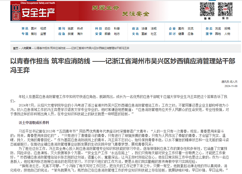中国安全生产网报道冯王奕相关事迹