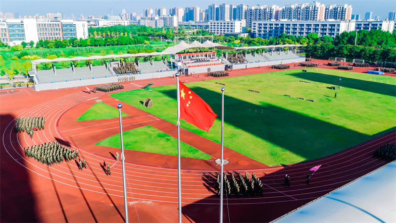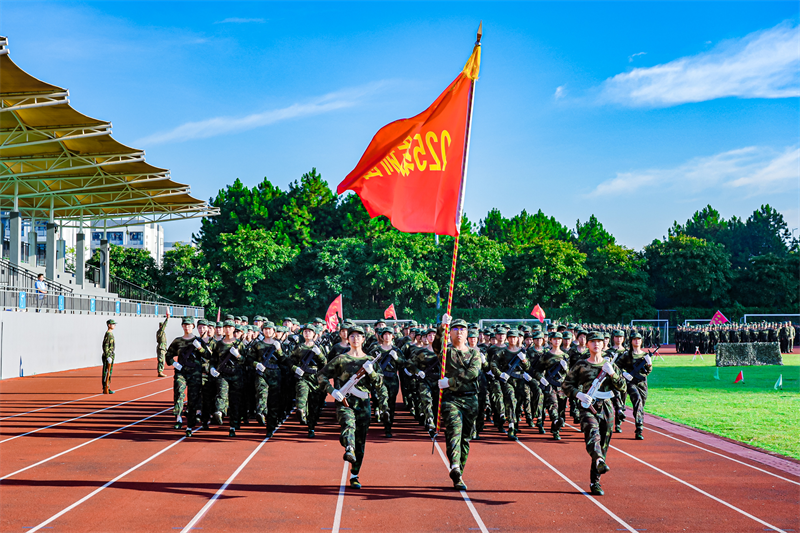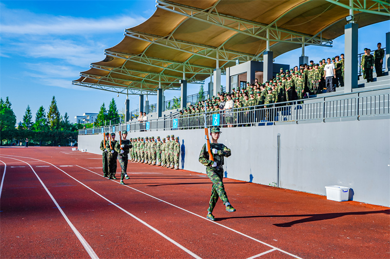 上午7时,伴随着中华人民共和国国歌《义勇军进行曲》的激昂旋律,五星红旗冉冉升起,全体人员肃立,行注目礼、高唱国歌。升旗仪式后,《分列式进行曲》奏响,军训团护旗队昂首擎旗、步伐坚定率先入场,各连队方阵紧随其后,迈着铿锵正步,依次通过主席台接受检阅,新生们以挺拔身姿、饱满精神与昂扬斗志,充分展现数日以来的军训成果与新时代青年的青春风貌。随后,军事技能展示环节有序开展,赢得现场师生阵阵掌声。