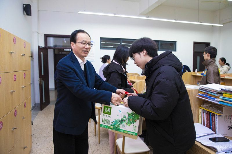 慰问现场,一份份精心筹备的“考研加油大礼包”传递着学校的深切关怀。礼包内不仅有考试文具、牛奶等实用物资,更有寓意“旗开得胜”的绍兴传统糕点“定胜糕”,将学校的深切关怀与美好祝愿融为一体。“学校太贴心了,感觉不是一个人在战斗!切实感受到‘大家庭’的温暖。”同学们收到这份特殊的礼物后备受鼓舞,纷纷表示将把学校的关爱化为冲刺动力,全力以赴,不负期望。