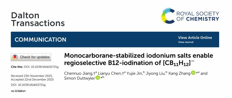 据张康老师介绍,该项研究的核心突破,在于成功构建一类新型高稳定性碘盐体系,实现了对硼团簇分子的“靶向”修饰,精准度远超传统技术路径。这一成果为新型药物分子与功能材料的开发注入全新动力,也为相关领域科研工作开辟了广阔空间。值得一提的是,这是该课题组继在《Inorganic Chemistry》《Chemical Communications》等国际知名期刊连续发表成果后的又一重要进展,凸显团队在无机化学研究领域的深厚积淀与创新活力。