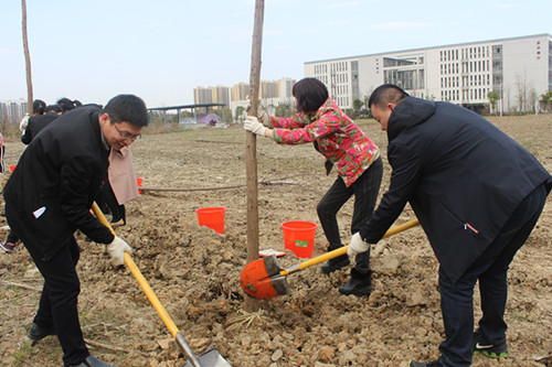 昨天下午,学院西大门左侧四季花海处、北区北大门左侧松树林处,百余名师生共种下70棵落羽杉。
