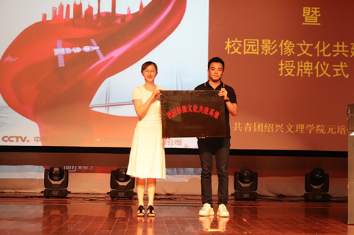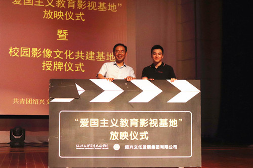 6月19日下午,学院“爱国主义教育影视基地”首映仪式暨校园影像文化基地共建仪式在国际交流中心报告厅举行。学院党委副书记宣海江、绍兴文化发展集团营销策划部经理高宏波出席活动,并共同按下象征电影开场的场记板。绍兴文化发展集团向学院授予“校园影像文化共建基地”铜牌。此次仪式标志着属于学院大学生自己的“校园电影院”正式投入运营。组织宣传部、学工部、团委、保卫处、语言文学分院相关负责人及各分院学生代表参加仪式。