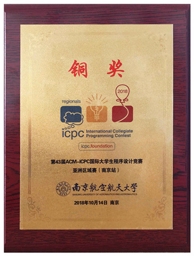 10月13-14日,第43届ACM-ICPC国际大学生程序设计竞赛亚洲区域赛(南京)比赛在南京航空航天大学举行。我院电子信息工程1501班金亮、计算机1602班周泽成、计算机1602班陈军组成的“哈士奇与扫雷王者”代表队(蔡尚真老师指导)获得铜奖。这是我院参加ACM国际大学生程序设计竞赛以来的历史最好成绩。