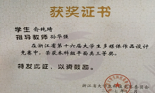 陈春晨:视觉传达设计1502班学生,学习成绩优异,曾获第十五届浙江省大学生多媒体作品设计竞赛三等奖、浙江省第八届大学生广告设计竞赛优秀奖、绍兴市第十届大学生多媒体作品设计竞赛二等奖。