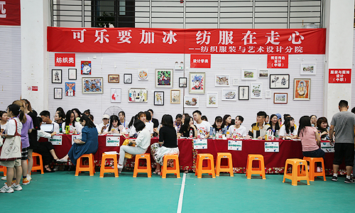 纺织服装与艺术设计分院“可乐要加冰,纺服在走心”的横幅,贴近00后的思想生活,表现了纺服不仅在迎接新生时教师与学生的“走心”,并且将“走心”融入到课堂和教育中去。今年纺服分院报到处不仅展示了来自学长学姐的优秀作品展览,还开展了新生对绍兴、学院和对大学生活憧憬的绘画作品征集活动,并将新生们的作品也做了一一展览。