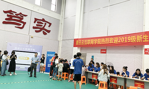 “腾讯云互联网学院热烈欢迎2019级新生”,信息与机电工程分院利用腾讯互联网学院专业优势,设置主题拍照展板,新生们站在展板后面,在展板的头像留白处拍照留念,期待大学生活新的开始。