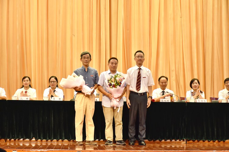 沈红卫为“教龄满30年”教师胡国军、张英宝献花