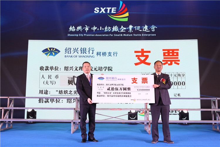9月29日晚,绍兴市中小纺织企业促进会(以下简称促进会)成立仪式举行。学院党委副书记石旭明、促进会会长江一玮出席仪式,代表双方签订合作协议。石旭明代表学院接受促进会的“纺织之光”大学生成长与实践基金25万元。纺织服装与艺术设计分院负责人、师生代表和模特队共同参加成立仪式。