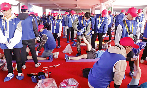 我院300余名志愿者队伍分别由来自学院各个分院的优秀学生组成,其工作区域分布在奥体中心东门桥下草坪地,主要为协助参赛运动员的赛后按摩、拉伸恢复。11月10日凌晨3时,月色尚未消退,志愿者们已纷纷穿上队服,乘着大巴向各自的岗位奔去。据了解,为更好地服务跑者,志愿者们和带队老师在大赛开始前半个月均陆续进行了路况指引、拉伸训练培训、突发状况应急等志愿服务指导,并多次勘察赛道熟悉赛场环境,确保跑者们的生命安全,并当好啦啦队和其他保障任务。