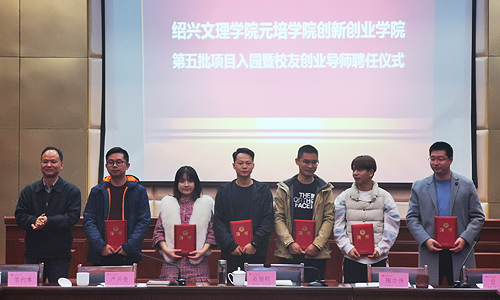 仪式上,招生就业处负责人与第五批入驻创业园项目负责人签订入园协议并颁发入园许可证,石旭明为学院首批六位校友创业导师颁发聘书。