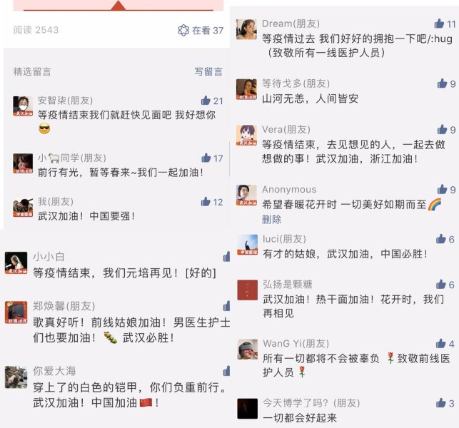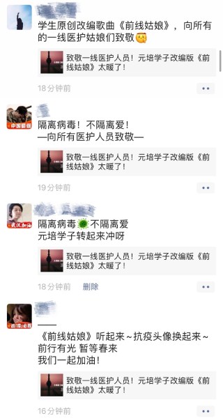“疫情下,医院病房,是前线的姑娘,你身披着白色的盔甲,你双手已受伤……”近日,一首歌曲《前线姑娘》在元培学院师生朋友圈间广为流传,该歌曲由绍兴文理学院元培学院学生江伶俐将歌曲《桥边姑娘》进行歌词改编,用歌声声援正在防疫一线奋战的巾帼战士们。歌曲一经发出,学院师生便纷纷转发推荐,大家纷纷表示“歌词深入人心,朗朗上口,歌曲温暖有爱,满满正能量,已经都会唱了”。不少师生更是用“想哭”、“感动”和“泪目”、“加油”的表情包,表达着内心的感受。