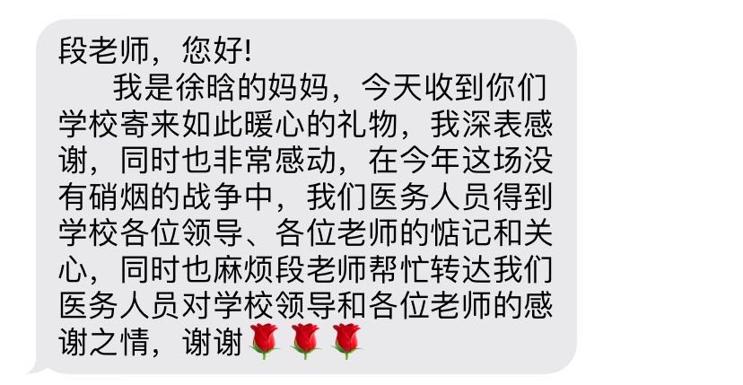 一位抗疫一线学院学生家长收到慰问礼品后对学院表示感谢