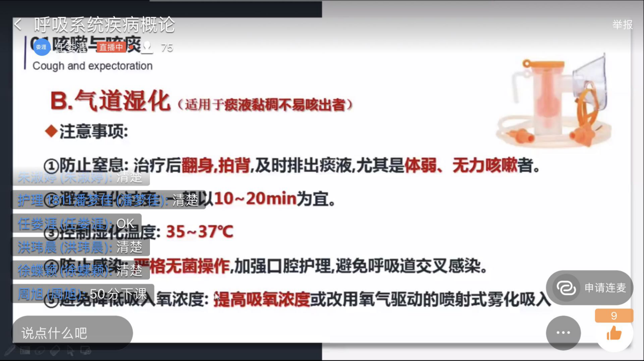 任娄涯在直播课堂中与学生讲解“呼吸系统疾病”相关知识