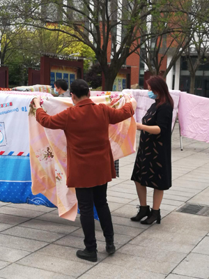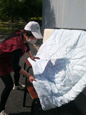 一清早,阿姨们就陆续接到了“订单”,开始了格外忙碌的一天。首先对寝室进行仔细消毒打扫、开窗通风,对寝室里的花花草草进行浇水除杂,一楼到六楼,每个楼道里都留下了阿姨们忙碌奔波的身影。天气晴好,在进行晾晒工作时,为了确保不出错误,阿姨们仔细核对宿舍床位,细心地在被子上用回形针挂好每一位同学的编号。放眼望去,寝室楼的天台上、楼宇间的空隙地,同学们心心念念的被褥都已经在愉快地晒着“日光浴”啦!聊天群里,当身处五湖四海的同学们,通过手机朋友圈看到宿管阿姨的暖心操作后,隔空开启了一波比心表白。待日落时,阿姨再帮同学们收回被褥,整整齐齐地铺好。来自汉语言专业的学生侯晓璐激动地说:“为了让同学们返校后能有舒适的住宿环境,学院真是太贴心了,考虑这么周到,为我们解决了后顾之忧。!”
