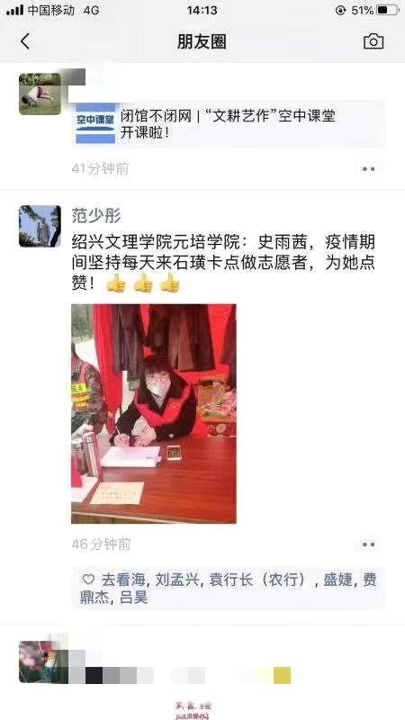 “元培学院的学生真不错,疫情期间天天来做志愿者,毫无怨言,工作很认真很负责,我为你们点赞。”嵊州市石璜镇防疫工作相关负责人表扬我院建筑工程分院造价1802班史雨茜同学积极参与当地防疫志愿服务工作,对其在抗击疫情的紧要关头,主动投身疫情防疫一线,充分发扬志愿服务精神及认真负责的工作态度给予肯定,同时对学院的人才培养工作表示感谢。