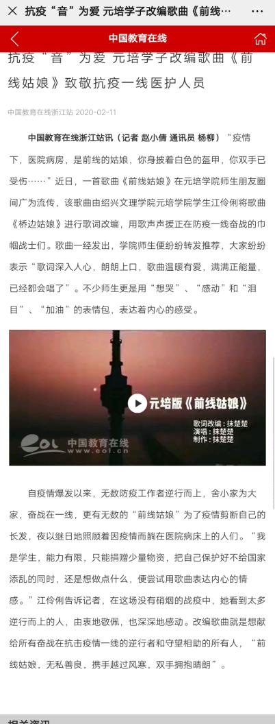 “疫情下,医院病房,是前线的姑娘,你身披着白色的盔甲,你双手已受伤……”全民抗疫期间,我院经济管理分院电子商务1701班江伶俐同学的一首改编歌曲《前线姑娘》在朋友圈热转,中国教育在线、浙江新闻客户端、越牛新闻等媒体相继报道,用歌声声援正在防疫一线奋战的巾帼战士们。