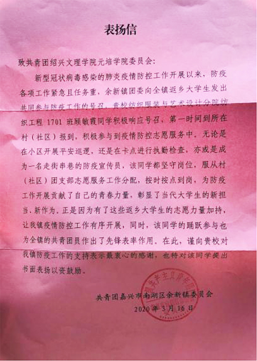 近日,我院收到一封来自嘉兴市南湖区余新镇委员会寄来的表扬信。在信中,余新镇委员会郑重表扬了我院顾敏霞同学为地区疫情防控工作做出的积极贡献,并向学院表示了感谢。