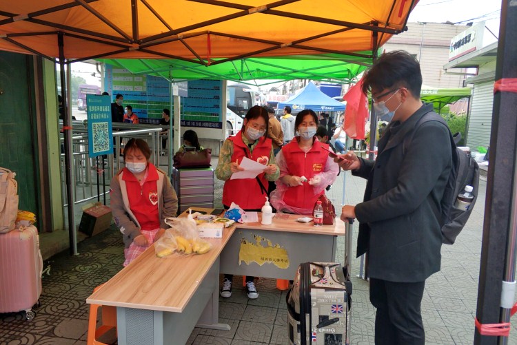 身处校园十几公里外客运中心的况细林、严立飞、潘思慧、沈立、王丽萍、徐丽、蔡佳丽等党员教师们每天也在重复着同样的工作。他们每天天色未亮就要到达接站点,摆放好帐篷和测温用具,贴上绍兴文理学院元培学院的标志,就开始了一天的等待和忙碌。客运中心学生流量虽然没有高铁北站多,但学·生比较分散,聚集起来很不容易,四天下来,他们共接待了两百余名返校学生。志愿者中不乏年近花甲仍然冲锋在第一线的教师,接站点负责人况细林介绍,每次有车进站,这些志愿者们都会兴奋焦急地望向大门口下车的人群,快速锁定学生,疾步至出口处逐一询问,生怕错过任何一个元培返校学生。