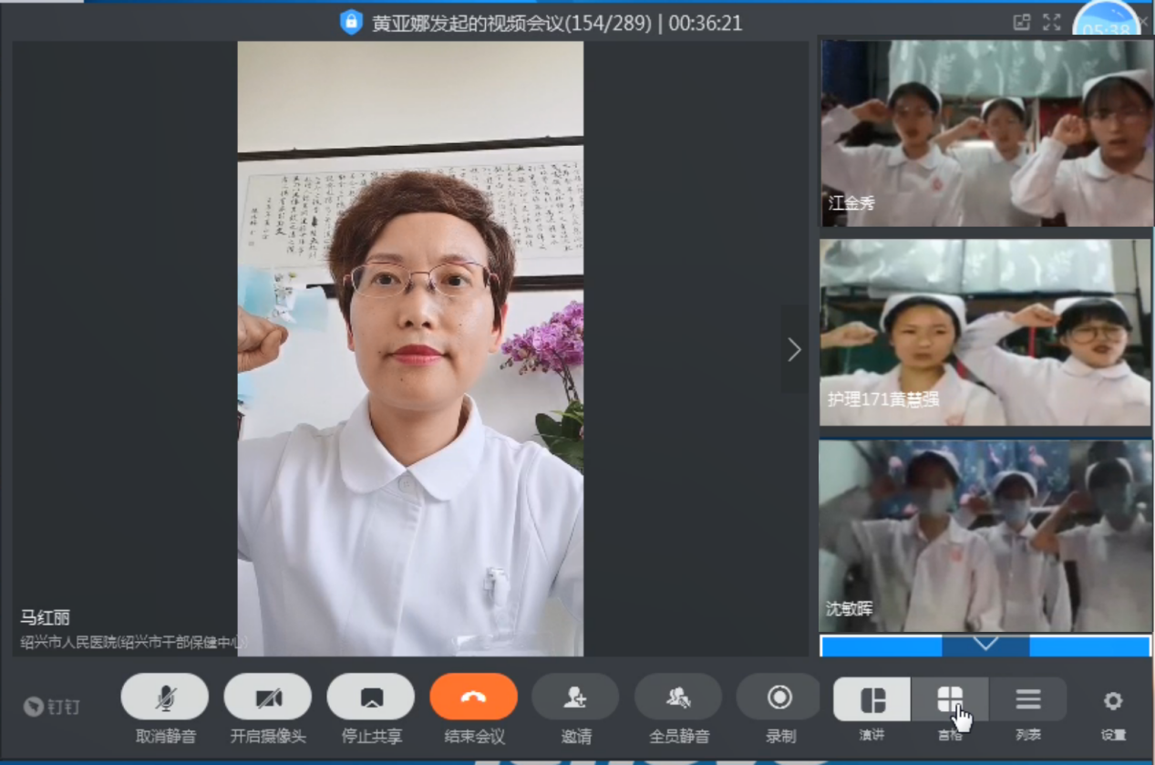 本次“云宣誓”邀请到绍兴市人民医院护理部主任马红丽同志作为领誓人,由她带领17届全体护理学生进行云宣誓。薪火相传,誓言铮铮。全体护理学生身穿洁白的护士服,右手握拳,抖擞精神,挺拔身姿,许下自己无悔从事护理事业的青春誓言。