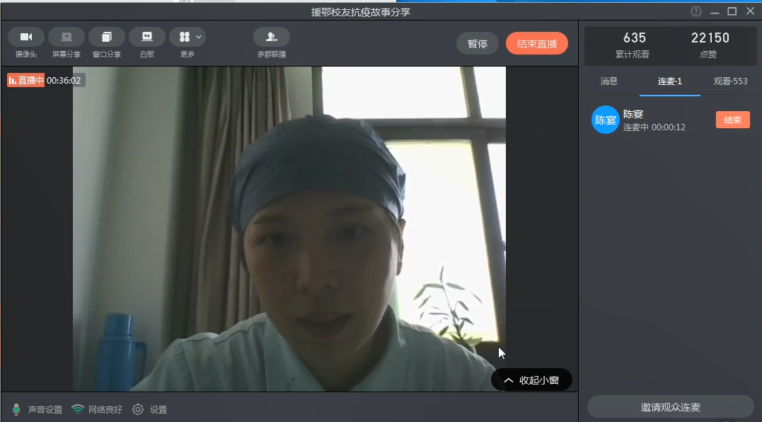 本次分享会通过线上直播的形式,共吸引分院师生、兄弟分院学生和校外同行近700人观看,共同代表医院以及元培人向出征的三位援鄂校友学习致敬。