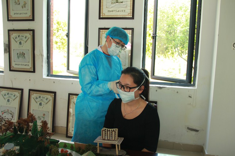 在学院西大门测温点,王兰芳头戴口罩与面罩,身着防护服,手持体温枪,在近三十度的气温下,严把着“入校关”。“西门作为学院疫情防控期间的唯一进出口,人流量较大,所以做到精准到人的体温筛查,是一项挑战,也是我们医务室各位同事共同努力和协同攻关的难题。”王兰芳说。开学返校期间,受炎热天气影响,体温偏高需要复查的学生较多,王兰芳和同事便带领他们到专属区域休息,每隔十分钟进行多次测量。一天8个小时,虽然面部被口罩勒出条条印记,汗水如蒸桑拿般浸透了层层衣裳,但王兰芳等医务人员毫无怨言,仍每天手持着体温枪坚持轮班站岗。