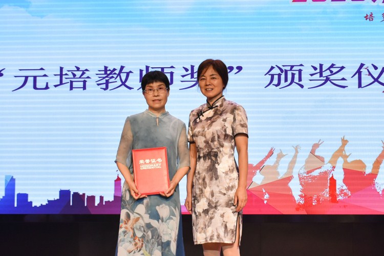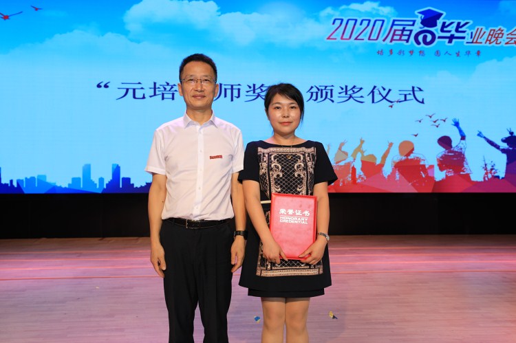 晚会上,学院教师最高奖“元培教师奖”颁奖仪式举行。学院副院长李黎宣读表彰文件。郝敬习、叶访春、沈红卫分别为获奖者纺织服装与艺术设计分院楼利琴老师、医药与健康分院杜轶君老师、经济管理分院蒋江林老师颁发颁奖词书法卷轴和荣誉证书。金汉强为三位获奖教师颁发奖金红包。石生元为三位获奖教师献花。