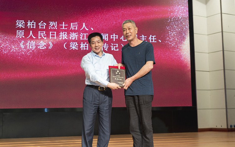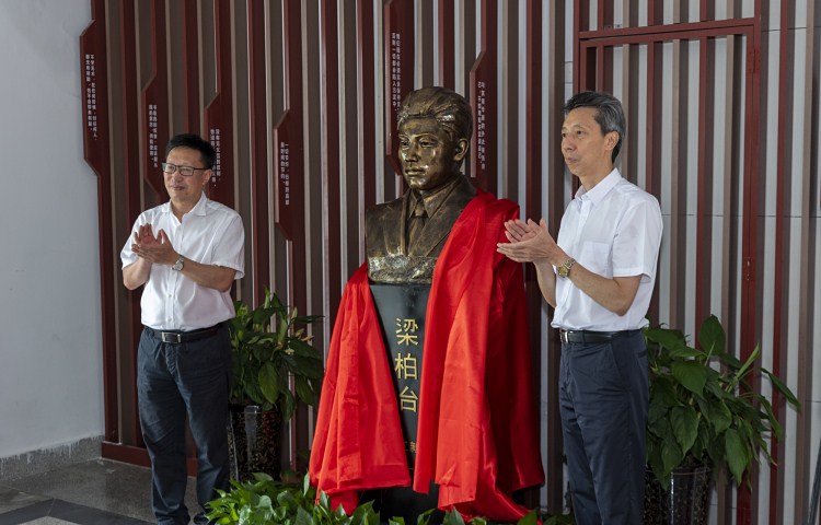 仪式结束后,领导嘉宾前往红色学府参加梁柏台纪念雕像揭幕仪式,共同参观梁柏台生平事迹展。汪俊昌和陈理平共同为梁柏台雕像揭牌。