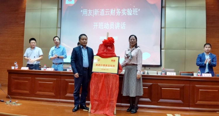 学院副院长李黎和新道科技股份有限公司浙江区总经理林斌共同为“用友|新道云财务实验班”揭牌