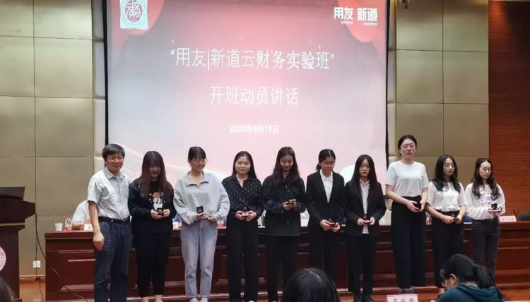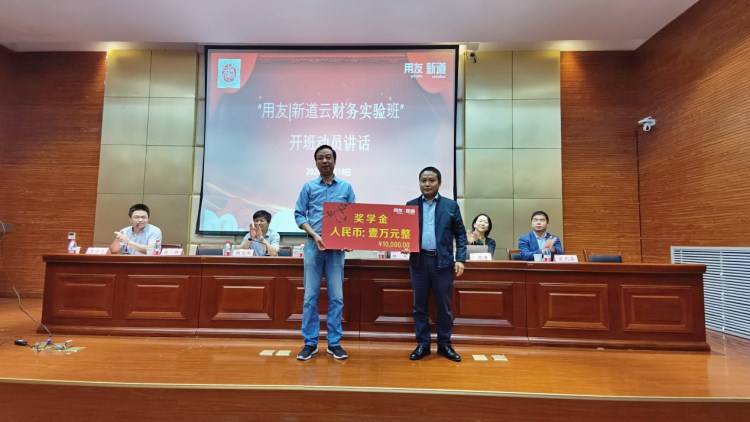 仪式上,李黎和林斌共同为“用友|新道云财务实验班”揭牌。校企领导分别为“新道云财务实验班”同学们颁发“云财务管理会计师”班级徽章。杨文兵作开班动员讲话,陈晖代表分院接受新道科技股份有限公司一万元奖学金捐赠。学生代表熊新雯发言。