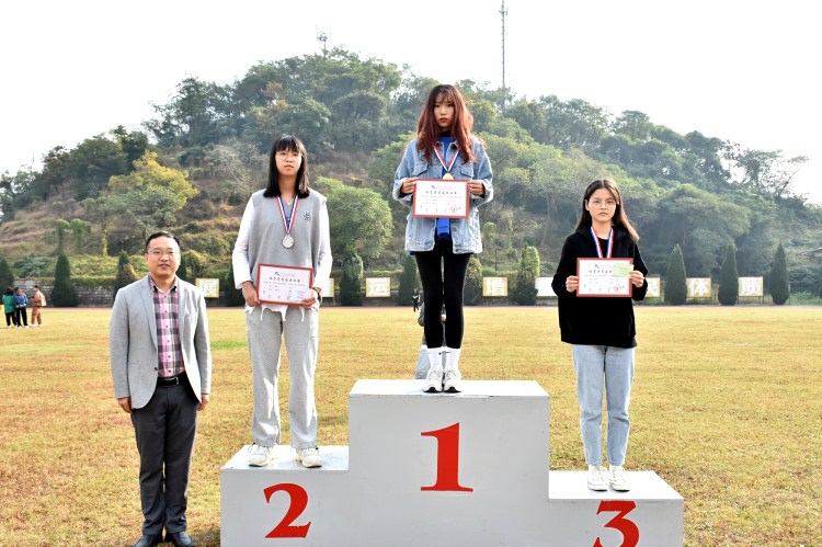 女子3000米项目第一名郑慧同学(左二)上台领奖