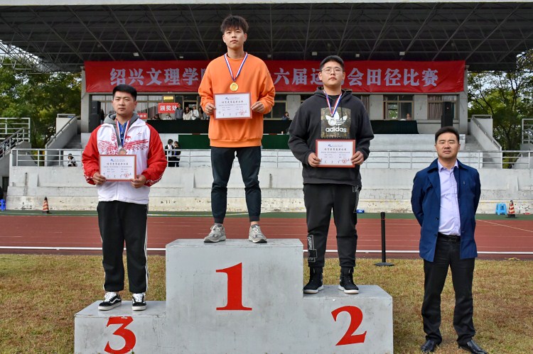 男子铁饼项目第一名潘世浩同学(左二)、第二名陈佳琦同学(右二)上台领奖