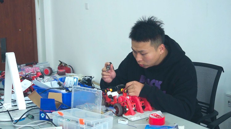 2019年11月,陈庚带着他的小车出发了!这次是“快递机器人”,主要是搬运物料,结构比较复杂。赛前,他不断在学校测试练习,“虽然会提前准备地图进行测试,但是与比赛现场相比还是存在很多不确定因素,比如,传感器是通过颜色折射率来看,不同环境折射率存在差异,即便是在学校调整好的代码,折射率也极有可能反应不出来。”为了提高精确度,陈庚和他的同伴天天泡在实验室,刚修改完数据,就抱着小车准备上四楼的调试实验室测试小车。小车开始缓缓走动,跑直线、抓取物料、识别扫码,再到避障、循迹、过山河、过桥梁,送到最终的地点,再按照物料最终的形状摆放……一趟下来,陈庚发现小车还是存在许多的问题,于是他匆匆忙忙抱起小车往二楼实验室赶,二楼是“修车”的地方,他需要对小车硬件、软件等方面再不断的进行调试。