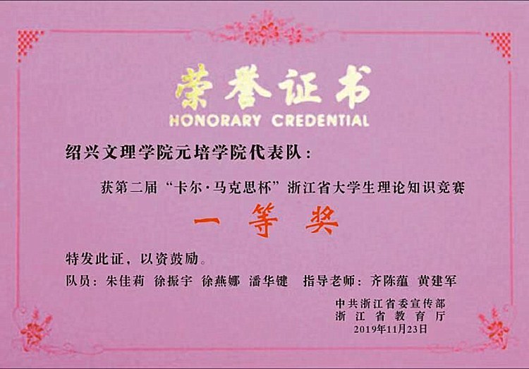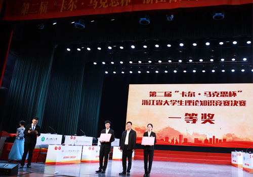 2019年11月23日,第二届“卡尔·马克思”杯浙江省大学生理论知识竞赛决赛拉开帷幕,由我院土木1701班徐振宇,国贸1701班朱佳莉,园林1702班徐燕娜、潘华键,物流1701班侯晓幼,翻译1702班郑璐组成的“星星之火”团队在与省内12所院校同台竞技中脱颖而出。赛事分为个人必答、时政述评、小组抢答、小组风险题四个环节,个人必答结束后,各团队分值极为接近,与“星星之火”分值相同的就有9支队伍,在时政述评,潘华键的旁征博引与有理有据的论述,让诸多观众为之动容,随后的小组抢答环节中,徐燕娜每按动一次手中的按钮,徐振宇、朱佳莉等人便毫不怯场、镇定自若的起身作答,每每都令场下的替补队员和老师们心跳加速。重重突围之后,“星星之火”团队的排名逐渐赶超靠前。前三环节的不错表现令队员们信心大增,队长徐振宇顶住压力同团队成员默契配合,凭借开阔的思路和全面的作答毅然拿下30分赶超对手,实现逆风翻盘,以286分的总成绩位列参赛队伍首位,获得省赛一等奖第一名,不负众望,载誉而归。