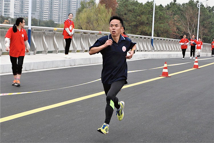 赵沭明,从2010年开始长跑并报名参加各项马拉松赛事以来,他的成绩不断刷新,总距离突破万米。在此次校园马拉松钟,他跟随着跑步第一梯队领先冲过终点,顺利过线后,终点处的裁判和老师们纷纷朝他挥手,激动地喊着“赵老师!赵老师!”,可他却摇摇头念叨:“慢了,这次慢了。”