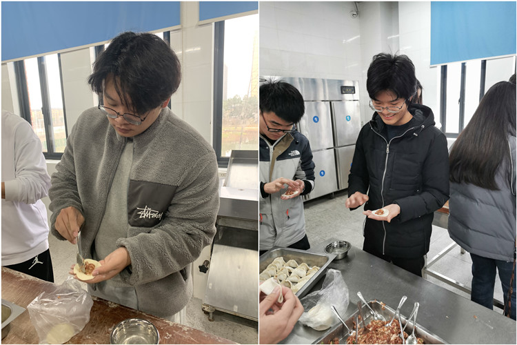 当天下午,“包饺子大赛”正式拉开活动序幕,揉面、和馅、擀皮、包饺子……小小的后厨间里人头攒动,好不热闹。师生们其乐融融,围在食材和桌子旁,相互交谈着寒假期间发生的种种趣事。在欢声笑语中,一张张面皮在同学们的巧手下被塑造成了不同的形态……“小时候在家过年,家人都会一起包饺子,后来基本都买现成的了。没想到这次留校过年还能体验一把儿时的味道,让我回想起儿时家的温暖。”来自工商1901的姜玉莹说。留校学生吴文月品尝着自己亲手包的饺子,一边捧着溜圆的肚子,一边连声称赞:“好吃,自己包的饺子就是香,还有那道安昌腊肠闻着就想起了老家院子里晾着的腊肠味儿!”