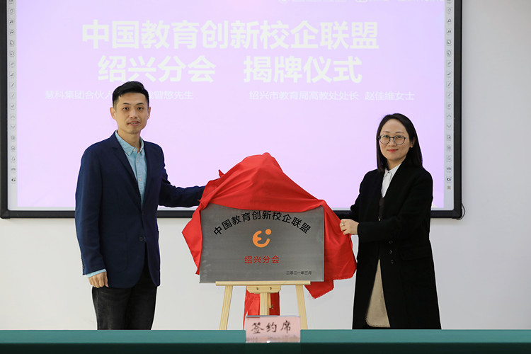 慧科集团合伙人、副总裁曾慜(图左)和绍兴市教育局高教处处长赵佳维(图右)为中国教育创新校企联盟绍兴分会成立揭牌