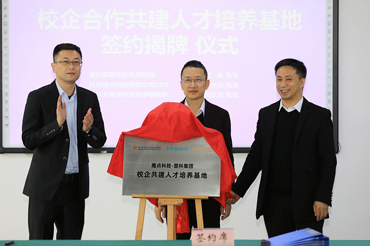 慧科集团华东区总经理竺浪(左一)、杭州魔点科技有限公司CEO肖传宝(右一)和学院院长沈红卫(图中)共同为校企共建人才培养基地揭牌