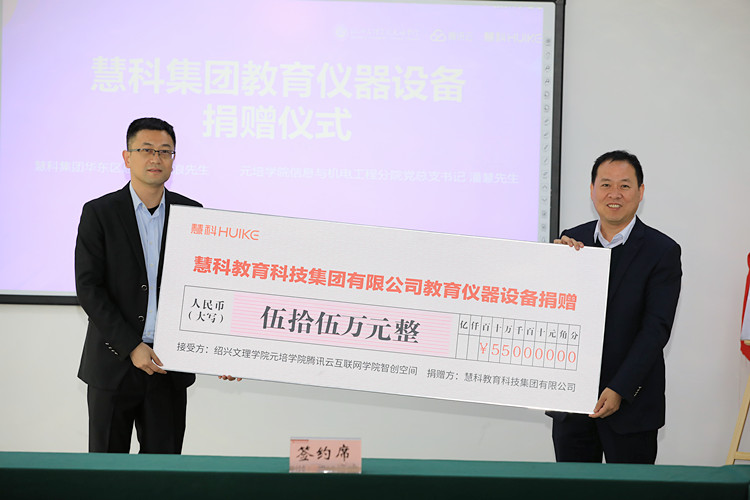 慧科集团华东区总经理竺浪(图左)代表慧科集团向学院捐赠55万元教学仪器设备,信息与机电工程分院党总支书记潘慧(图右)接受捐赠