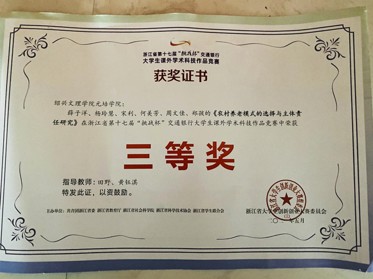 近期,浙江省第十七届“挑战杯”大学生课外学术科技作品竞赛落下帷幕。我院学子作品《农村养老模式的选择与主体责任研究》(项目成员:薛子洋、杨玲慧 、宋利、何美芳 、周文佳、郑孩;指导老师:田野、黄钰淇)荣获省三等奖。