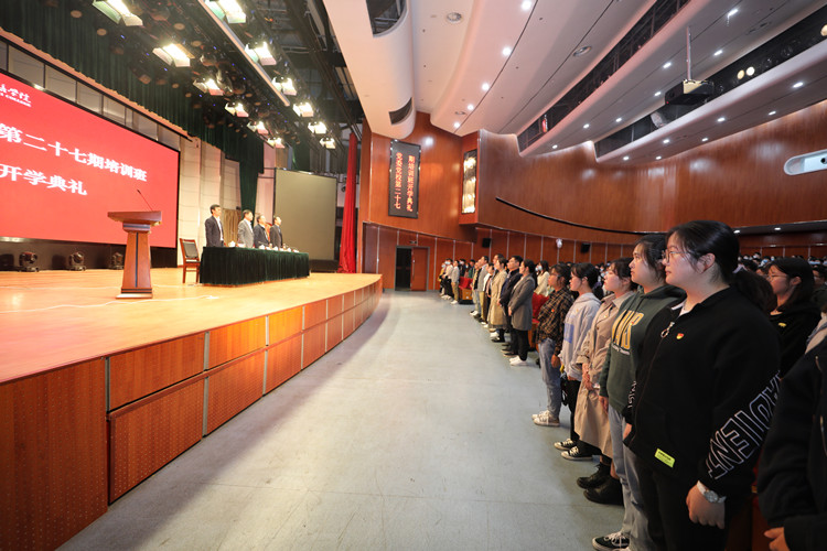 开学典礼在庄严的《国际歌》中拉开帷幕。大会宣读了第二十六期预备党员、入党积极分子培训班结业文件和优秀学员名单。石旭明为优秀学员代表颁发荣誉证书。第二十六期预备党员优秀学员代表李珂静、第二十七期入党积极分子学员代表段泽成先后发言。