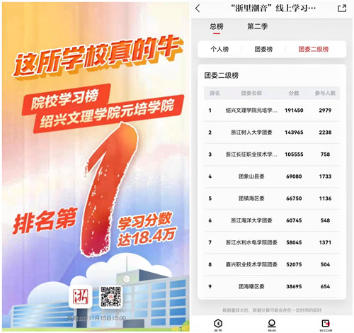图左:截至11月15日我院位列全省高校第一;图右:截至11月18日晚我院学习情况位列榜首