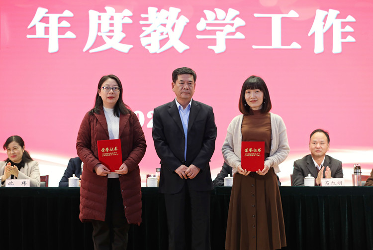 学院副院长沈玮为2020-2021学年认定为“互联网+教学”A级课程的杜轶君、王丽佳、王鉴莺三位老师颁奖