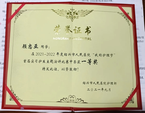 护理1811顾忠亚和护理1812余悦分别在2021-2022年度绍兴人民医院“我的护理梦”实习护生演讲比赛中获得一等奖、二等奖
