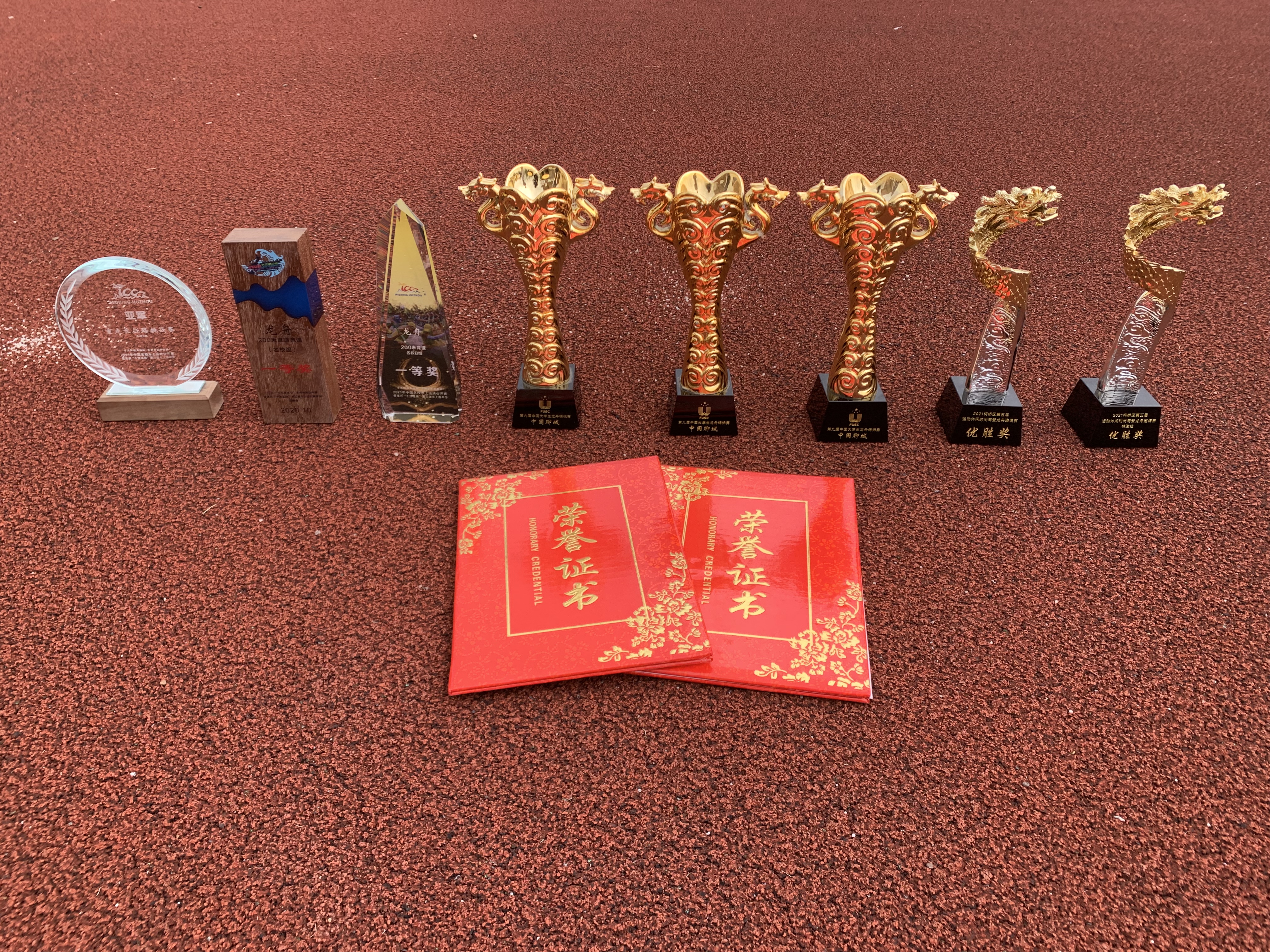 指着训练室的墙壁上挂满的各高校队旗和排列的奖状奖杯,桨手何海成向记者介绍:“每一次学校间交流比赛,我们都有交换队旗的习惯,这不仅是对手间的认可,更是龙舟队每次参赛的光荣见证。” 自2019年重新编组以来,元培龙舟队用仅仅一年半时间,南征北战,奋楫拼搏,满载而归,捧回了2021年中国名校水上运动公开赛龙舟200米直道赛高校B组第一名、高校组桨板第二名;2021年全国大学生龙舟锦标赛荣获团队总成绩第五名;2020年“长三角之心”漾舟精英公开赛龙舟200米直道赛高校B组及桨板的双冠第一名;2021年绍兴市曹娥江龙舟竞渡活动200米第一名等各类国家、省、市级比赛奖杯。