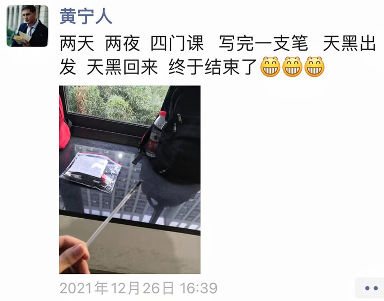 冲刺在即,坐在考研自习室里的黄宁人,看着同伴们埋头苦读的身影,还有走廊上研友来回走动不停背诵的身影,内心深深地被鼓舞着,“不论结果如何,都要坚持下来。”他缩短每天吃饭的时间,争分夺秒地为自己争取更多的复习时间。翻皱了的纸张和密密麻麻的标记是他奋斗的印记,数学模拟考130分-140分的水平让他的斗志也越发强烈。不论是学习水平还是考试心态,他把握着自己的节奏,坚持到了考研前一天。