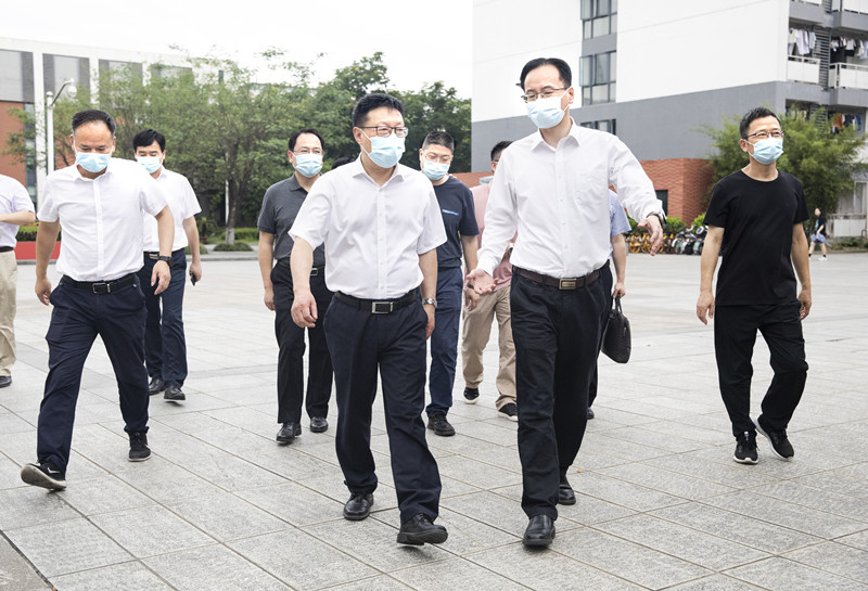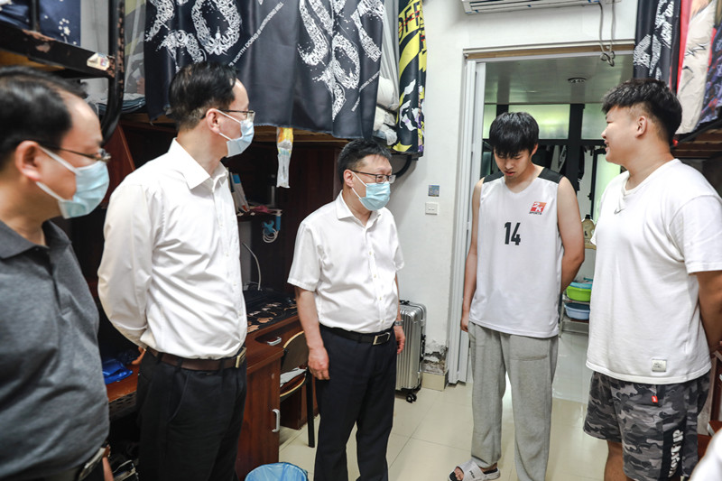 汪俊昌一行先后来到学院南区学生公寓、群贤楼食堂、田径场核酸检测场地、大学生媒体中心等地实地察看,认真听取有关工作情况汇报,亲切关怀慰问学生学习生活,详细询问关于校园管理与服务、疫情防控、期末相关工作等情况。