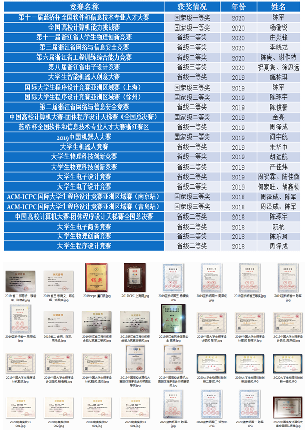 (3)学科竞赛成绩斐然,在机器人竞赛、程序设计竞赛、网络与信息安全竞赛、物理创新竞赛中优势明显,处于省内同类院校前列。2018-2020年获国家一等奖3项、二等奖1项、三等奖4项;省一等奖5项、二等奖11项;连续七年获得绍兴市大学生计算机技能竞赛团体一等奖。