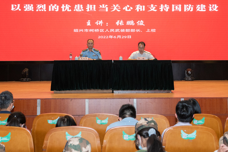 为进一步增强我院广大师生、党员干部的国防意识和国防观念,牢固树立党管武装的责任感和使命感,在建党101周年来临之际,6月29日上午,学院在国际文化交流中心报告厅召开党委理论学习中心组集中学习(扩大)会议,邀请柯桥区人武部部长、上校、学院2020、2021级军训团团长张鹏俊作题为《立足百年变局看俄乌冲突 以强烈的忧患担当关心和支持国防建设》专题辅导报告。学院和分院两级党委中心组成员、学院党群部门负责人以及军训学员代表参加会议。本次讲座既是一堂大学生国防教育课,也是学院党委理论学习中心专题报告会。院党委书记梁瑜主持会议。