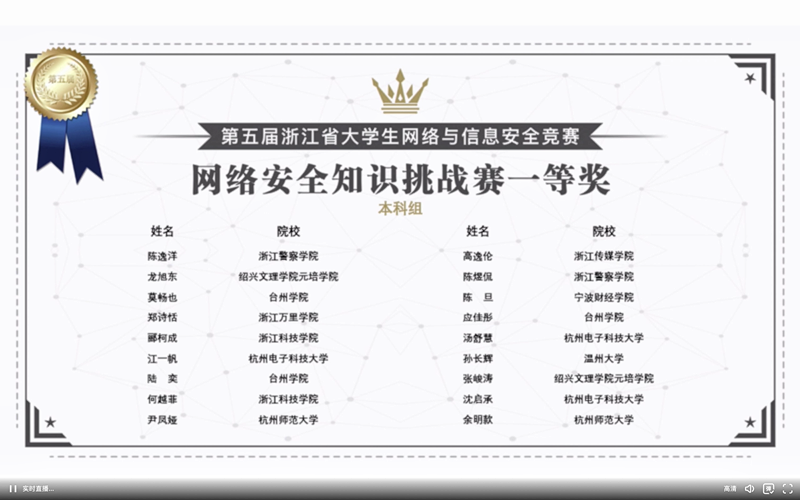 近日,浙江省大学生科技竞赛委员会传来捷报,我院学子在第五届浙江省大学生网络与信息安全竞赛中创佳绩。在技能挑战赛中,由施滢琦、刘明嘉、赵宁组成的团队获得浙江省一等奖,李雅程、林德钢、郭钊恺组成的团队获得浙江省三等奖;知识挑战赛中,龙旭东、张峻涛两位同学分别获得浙江省一等奖2项,马叠良同学获得浙江省二等奖1项,李卓屹、张认、刘泽林、郑依楷、张以诺、叶茂斌、杨佳栋、邱宇杰、严志键、沈佳科、张恩雨、应奇钢十二位同学分别获得浙江省三等奖12项(指导老师:徐志望、张祎江、杨婷)。